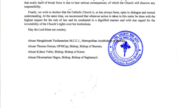 Catholic Bishops of Eritrea “Peace to those who are far off and peace to those who are near” (Eph 2:17) An appeal for Peace and National Reconciliation Pastoral Letter   Greetings Dear children in the Lord, our beloved people, all you seekers of peace: “Grace to you and peace from […]